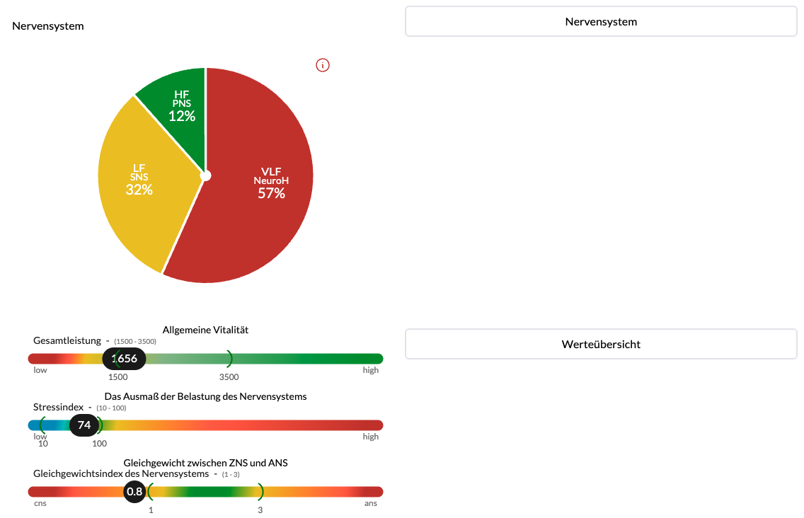 Im Gegensatz zu vielen herkömmlichen HRV-Messungen zeigt HeartQuest 21 entscheidende Gesundheitsindikatoren in einem leicht verständlichen, farbcodierten System. So erkennen Sie auf einen Blick, wie gut der Körper reguliert und wo mögliche Risiken oder Belastungen bestehen.
